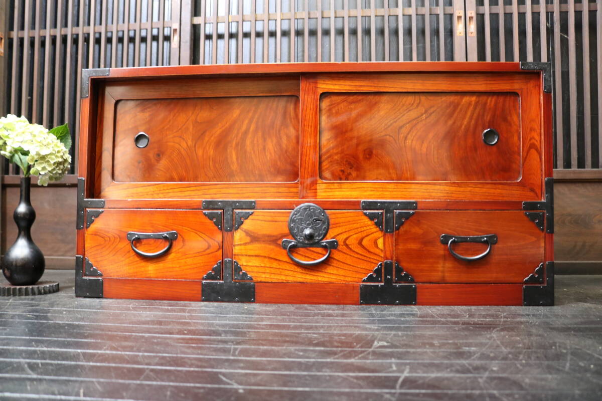 - 【伊董】C103.アンティーク!和モダン!TV台!古い時代箪笥山形県最上地方桜丸金具引戸付き半箪笥抽斗三杯明治後期~大正欅共縁 #和家具