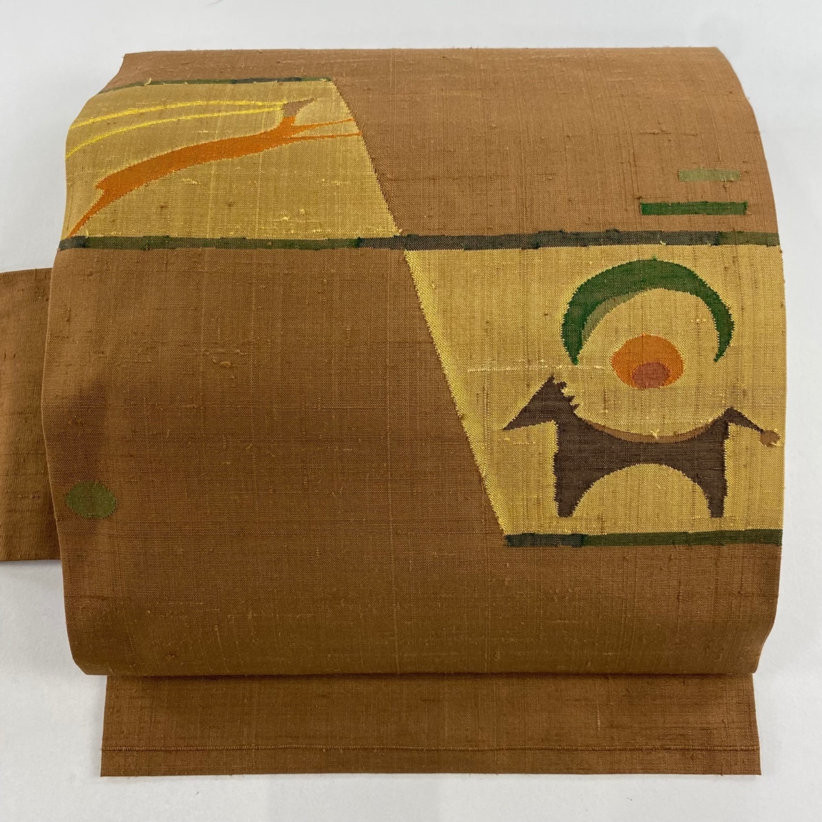 - 名古屋帯 美品 秀品 落款 紬地 関西仕立て 動物 幾何学模様 茶色 正絹 【中古】