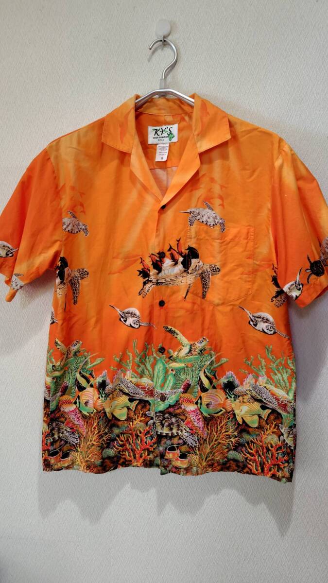 - 極彩色アロハ★KY'S Made in Hawaii ハワイ直輸入 希少サンゴ礁柄 海亀 コットン100% サイズM(日本サイズL~XL程度)