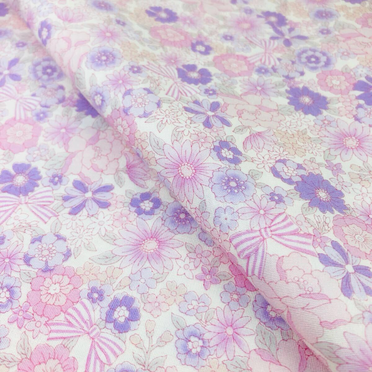 > 1m 日本製 可愛いリボンと小花のブロード生地 コスモテキスタイル はぎれ ブロード コットン パステルピンク