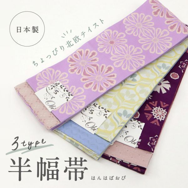 > 【半幅帯】 フラワー北欧テイスト 『type A』 リバーシブル 長さ4m 小袋帯 半巾帯 ポリエステル100% 全3柄 k24-14