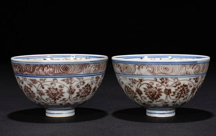 - TM171■明永楽 釉里紅纏枝花卉紋鶏心碗一対 時代物 古玩 唐物 古陶磁器■