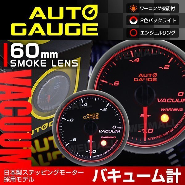 > 日本製モーター仕様 新オートゲージ バキューム計 60mm 追加メーター 静音 ワーニング機能 エンジェルリング 白 赤LED スモーク [458]