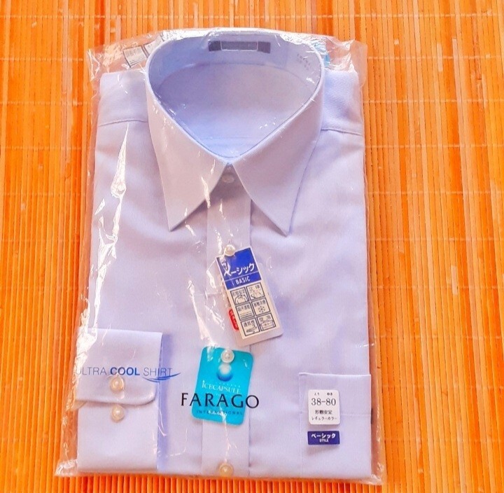 > FARAGO ワイシャツ青メンズULTRA COOL SHIRTえり38 ゆき80 ベーシックスタイル形態安定 接触冷感紳士