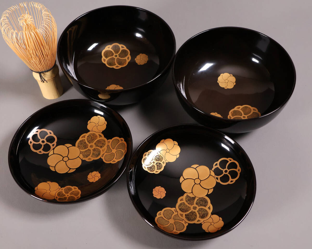 - 漆芸 木製漆器 捻り梅 金蒔絵 黒塗 御椀 二客 茶懐石道具 伝統工芸品【MA775】