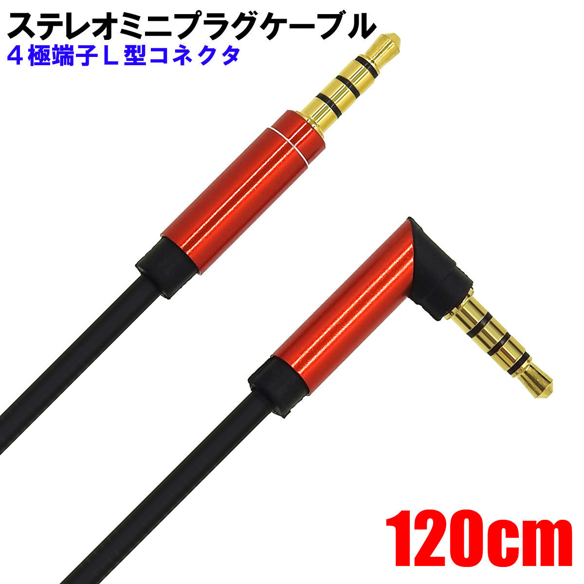 > ステレオミニプラグケーブル L型 両プラグ 長さ1.2m(120cm) レッド/ブラック 金メッキ端子 4極 高音質 AUX オーディオ[OFC4-ALR]