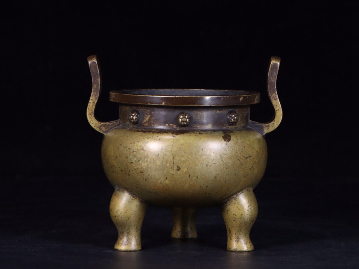 - 「清代 芳窗珍賞 古銅彫 三足官帽耳老銅香炉」旧銅器 置物擺件 賞物 中国古美術 旧蔵出