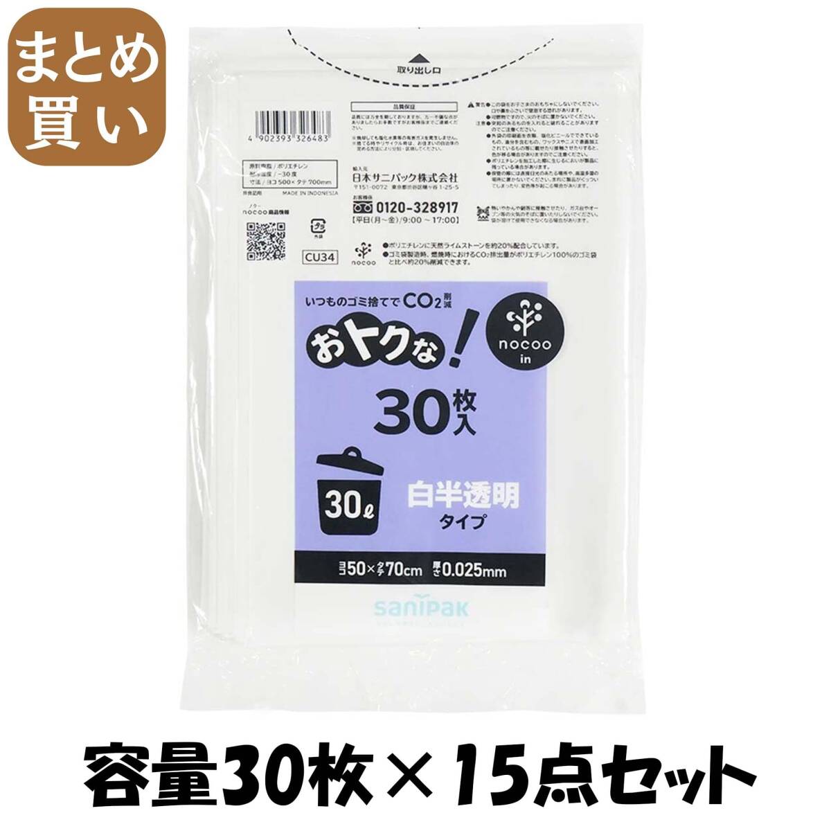 - 【まとめ買い】CU34 オトクナ 30L 白半透明 20枚 容量30マイ×15点セット 日本サニパック ゴミ袋・ポリ袋