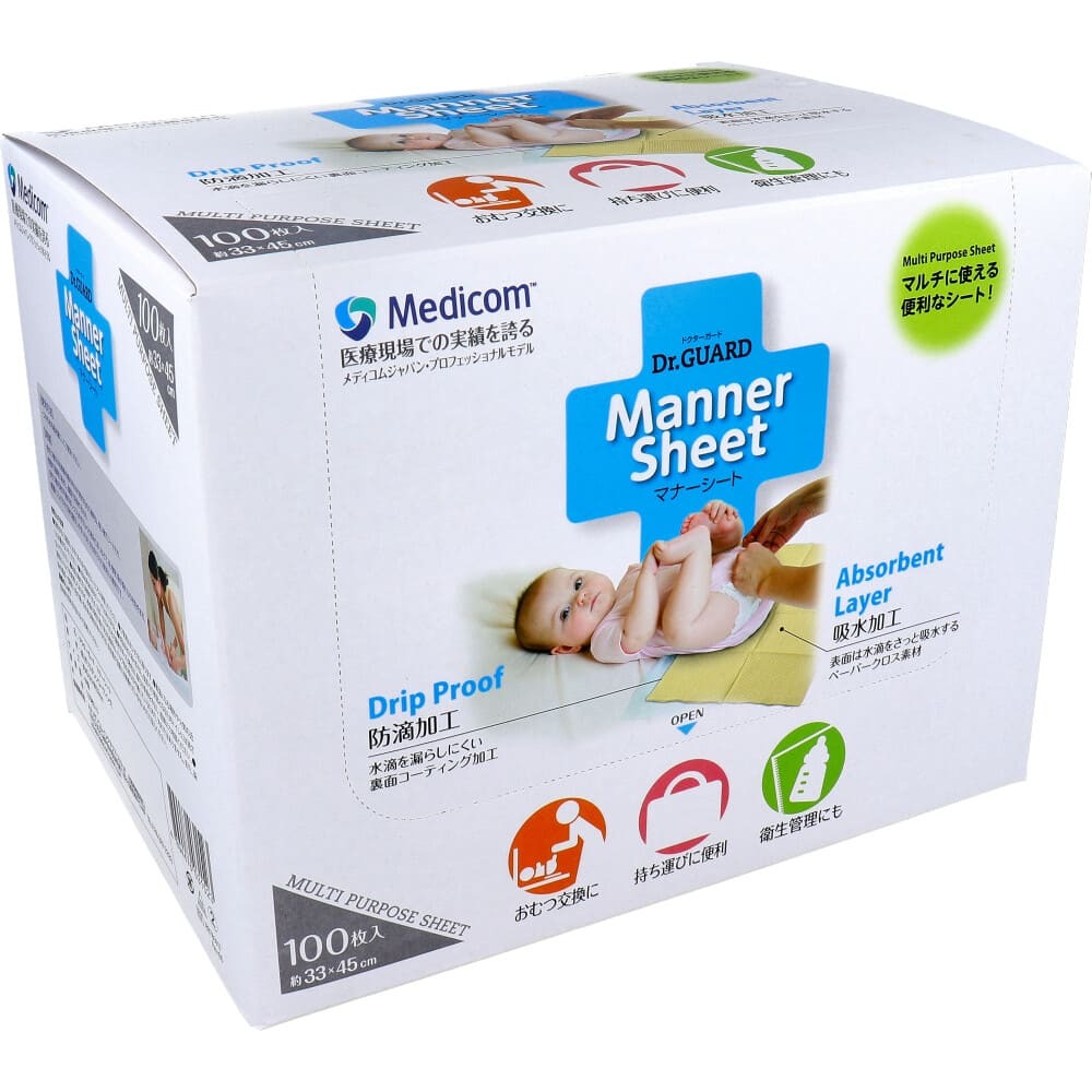 ▼▼▼▼▼▼注意事項▼▼▼▼▼▼・送料込み(送料700円が商品価格に含まれています) 一部地域では追加送料あり。・お取り寄せ商品です。弊社にて手配後、メーカー・卸業者からの直送になります。・まれにメーカー欠品、出荷遅延等が発生致します。問題発生時は別途メールにてご連絡致します。・配送方法の指定、日時指定、置き配、ギフト対応、他商品との同梱配送などは対応できません。・まとめ買いや複数購入の場合は通常より発送に時間が掛かる場合がございます・複数個口の場合、2階以上への搬入ができない場合があります。(その場合は1階での受け渡しとなります)・大型連休、お盆、年末年始などは発送をお休みさせていただく場合がございます・メーカー都合により、パッケージは予告なく変更される場合がございます・梱包用のダンボールはリサイクル品を使用させていただきます。・注文に関するご連絡(注文確定通知・発送通知など)はメールでご案内させていただきます※商品ページの内容について、少しでもご不明な点などがございましたら購入前に一度ご連絡ください▲▲▲▲▲▲注意事項▲▲▲▲▲▲〇商品説明医療現場での実績を誇るメディコムジャパンから、プロフェッショナルのノウハウを活かしたマナーシートです。●防滴加工。水滴を漏らしにくい裏面コーティング加工。●吸水加工。表面は水滴をさっと吸水するペーパークロス素材。●2重構造。表面は吸水仕様、裏面は防滴仕様の2重構造です。ツヤのある方を下にしてご使用ください。●小さくて軽い。折りたたんだサイズは、母子手帳とほぼ同じサイズ。小さくて軽いので荷物の邪魔になりません。●おむつ交換に。外出先でも汚れを気にせずに。●持ち運びに便利。コンパクトなので、負担にならない。●衛生管理にも。ベビー用品等の下に敷いて清潔に。【素材】紙(ポリエチレンコーティング)【サイズ】約45cmX約33cm【使用方法】・つやのある面を裏にしてご使用ください。【用途】・おむつ替えやお食事の際の汚れを予防するのに便利な、使い捨てシートです。・表面で適度に吸水し、裏面で防滴するため、おむつ替え時の不意のおしっこもれやミルクの飲みこぼしなどで、床、敷物、服が濡れるのを防ぎます。・軽量・コンパクトで持ち運びしやすいため、外出先でのご使用にも便利です。【使用上の注意】・湿気がなく清潔な、お子さまの手が届かないところに保管してください。・ご使用は大人の方に限ります。・高温になる場所や火気の近くには置かないでください。・本品は完全な防水シートではありません。・本品は水に溶けません。詰まりの原因となるためトイレには流さないでください。・お肌の触れても無害ですが、万が一かぶれなどの異常があった場合は、直ちに使用を中止し、医師にご相談ください。・原料にパルプを使用しております。表面の茶色や黒く見える箇所は、パルプ皮の残りが付着しているためで、汚れではありません。また、染料の塊が一部残り、色の濃い点がある場合がありますが、安全面や品質には影響ございませんので、ご安心ください。【廃棄のしかた】自治体の定める方法に従って処理してください。〇商品仕様個装サイズ:240X185X175mm個装重量:約845g内容量:100枚入原産国:中国【発売元:A.R.メディコム・インク・アジア・リミテッド】(出典:メディコムジャパン)