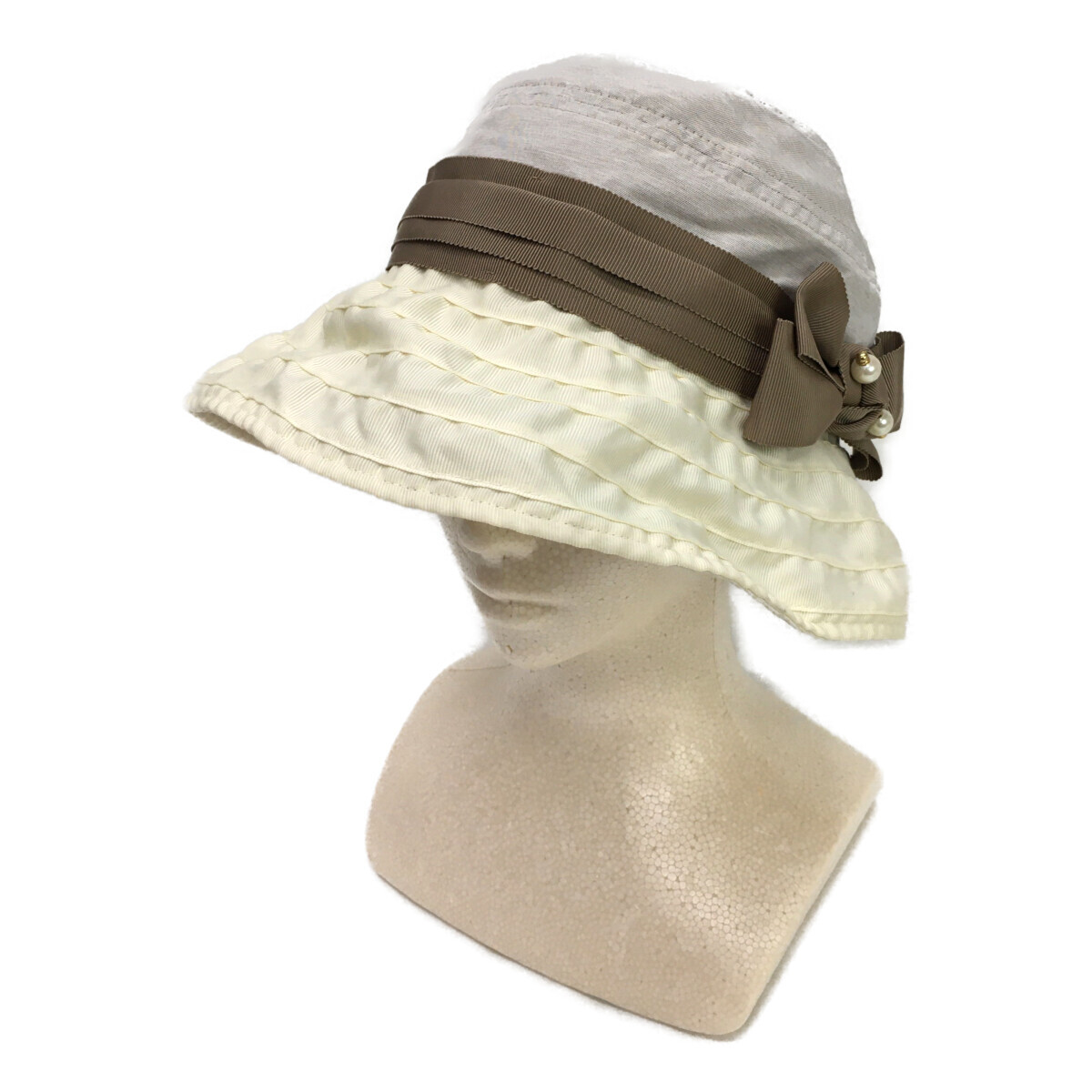 - coco 中古【値下げ】 ランバンオンブルー バケットハット ブラウン×クリーム リボン パールチャーム レターパックプラス発送可 K9247