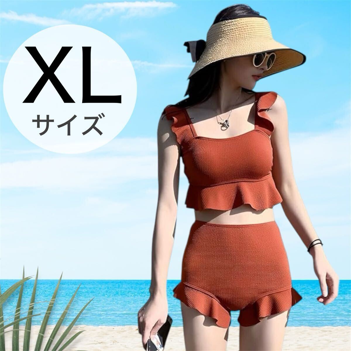 - 大特価 水着 レディース ビキニ ハイウエスト フリル 速乾 体型カバー 夏 海 かわいい 妊婦 胸パッド付 オレンジ 橙 XL ゆったりサイズ