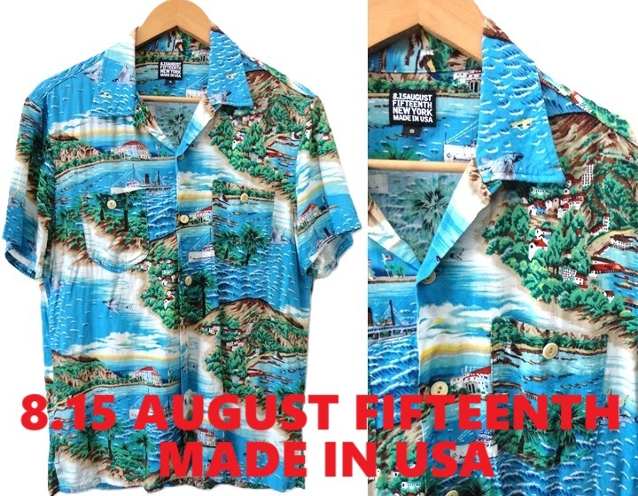 - USA製/8.15 AUGUST FIFTEENTH:オーガストフィフティーンス/海 風景画 柄 レーヨン アロハシャツ/ハワイアンシャツ/ライトブルー/Ssize