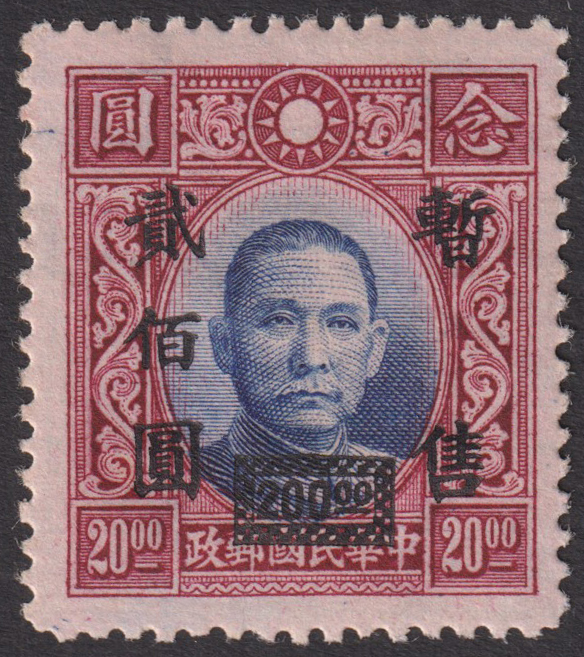 - 中国占領地切手 JPS:8C77a 華中 圓字断肩 暫售加刷 大東版孫文票 すかしあり 200円/20円 未使用 2122