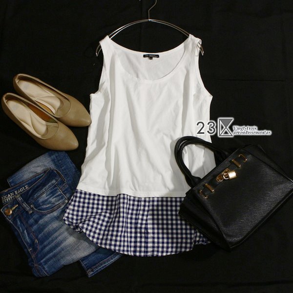 > 美品 オンワード樫山 23区 可愛いコットン・チェック柄 切り替え ストレッチ タンクトップ 40号 L 春 夏 25E07