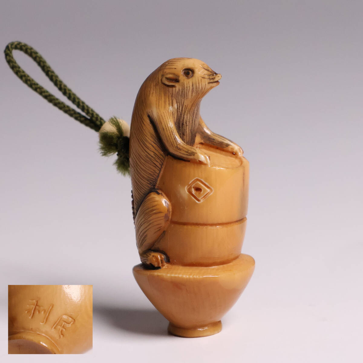 - 時代堤物 根付 在銘 利民 牙彫 動物 獣 ハクビシン 鼠【CM250】