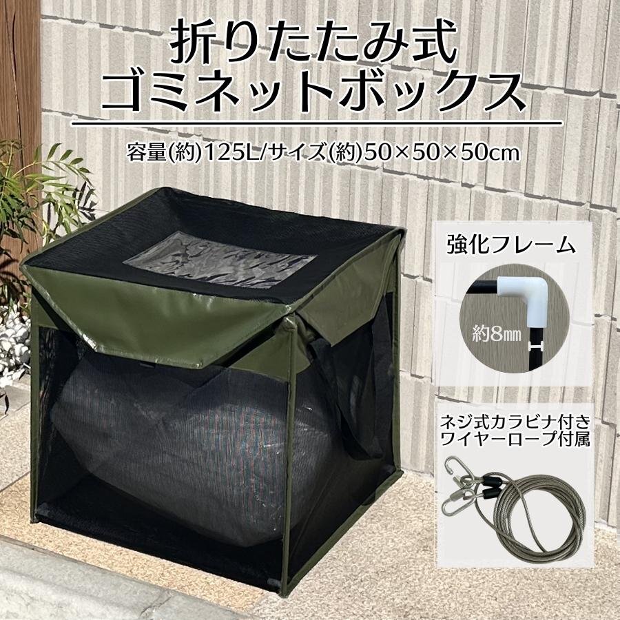 - ゴミネットボックス約125Lダークグリーン蓋ありゴミ荒らし防止 折りたたみ式ゴミ収集ボックス 約50×50×50cm 戸別収集用 網箱125Lグリ-ン