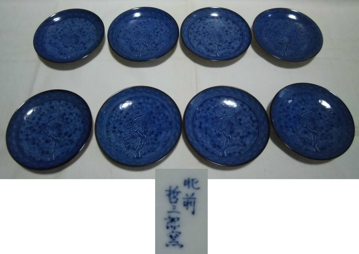 - 小皿 肥前焼 哲三郎窯 8枚 梅花柄 染付 陶器 食器 工芸品 レトロ