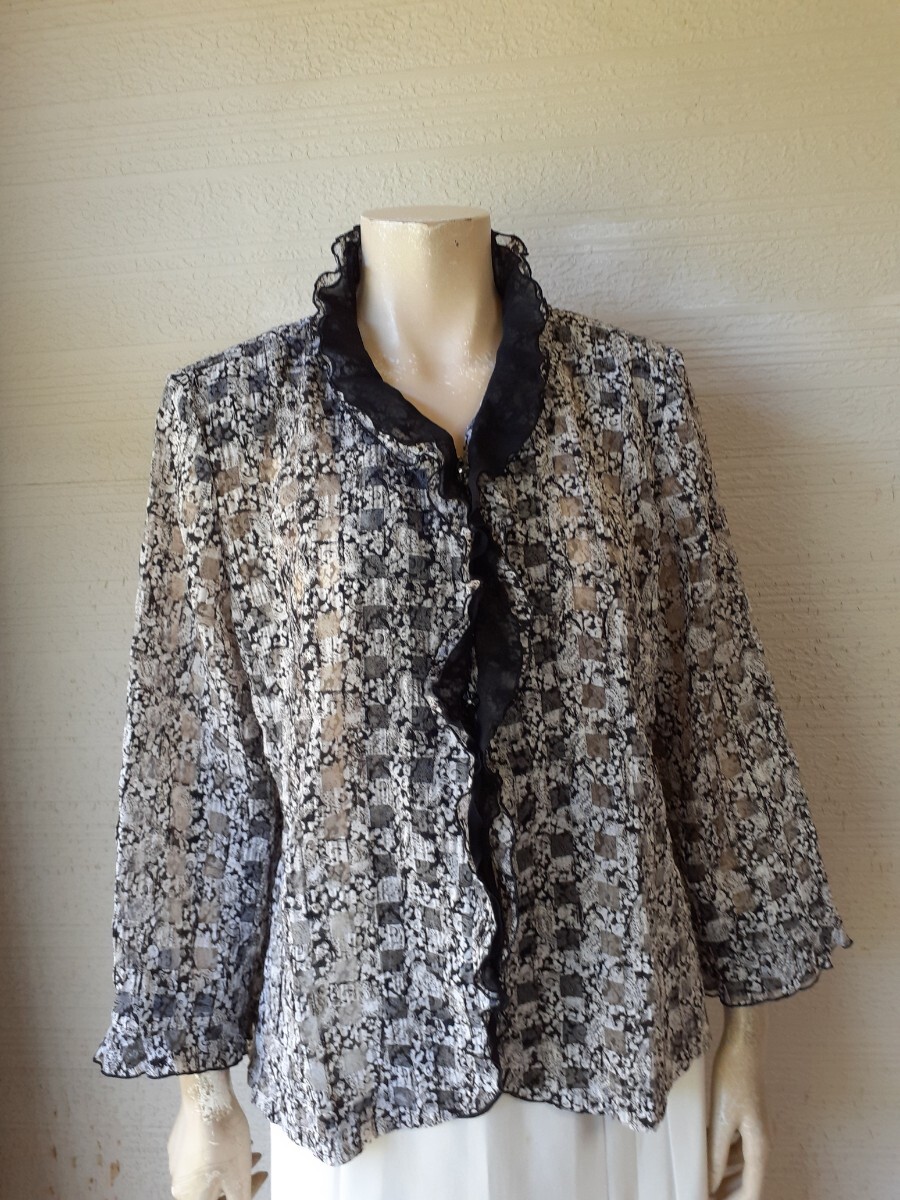 - ちぐさ ボーベル*Bowbell★美品★ジャケット★フリル使い★上品な透け感★モノトーン★大きいサイズ15号