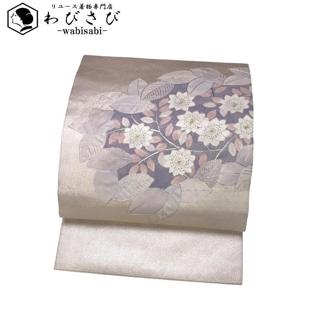 > 名古屋帯 花模様 相良刺繍 金銀糸 灰桜色 O-5253 着物 きもの kimono 和服 和装 中古 リサイクル着物 【送料無料】