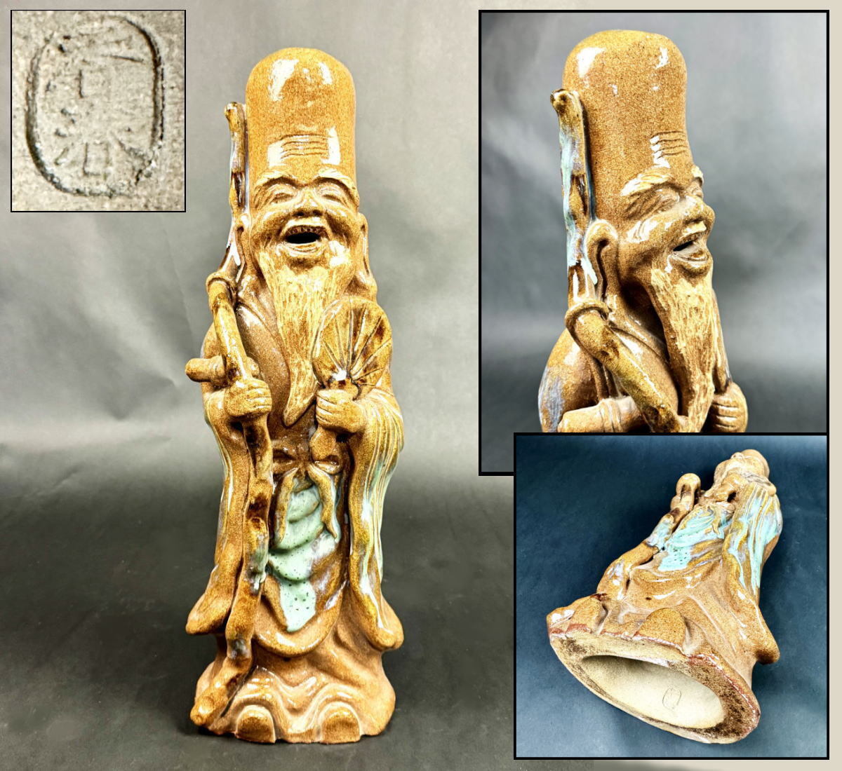 > 【送料無料】時代物 香春在銘 寿老人 壽老人 陶器 焼物 高さ約47cm 七福神 置物 古美術 日本骨董 コレクション文化財 (旧家蔵出し) WWTT006