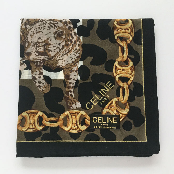 - セリーヌ / CELINE ハンカチ ヒョウ柄 透かし入り白/ブラウン生地 黒ふち【6377】