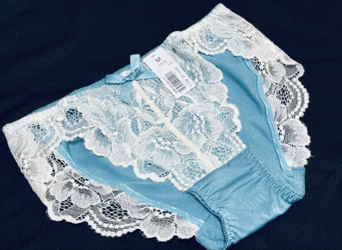 - サックスブルーにホワイトの刺繍レースが清楚なお嬢様系★aimerfeelデザインショーツ★Mサイズ