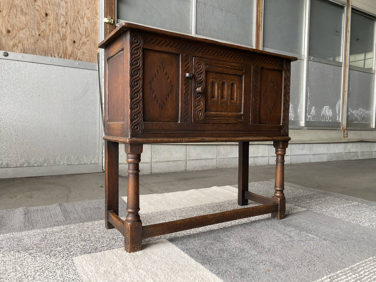 - 【英国 イギリス アンティーク】サイドボード コンソール 収納 キャビネット 総無垢 オーク材 ゴシック文様 店舗什器 蚤の市