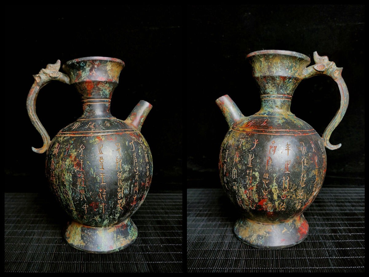 - 「戦國時期 青銅器彫 龍柄青銅銘文壺」青銅器 置物擺件 賞物 中国古美術 旧蔵出