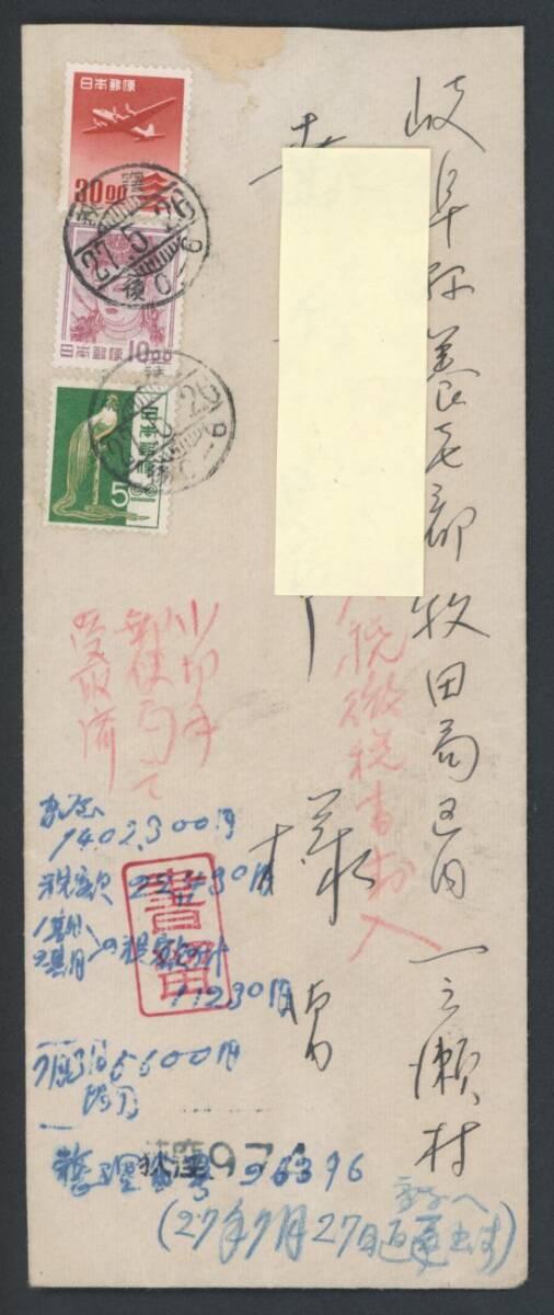 - w120 エンタイヤ 30円「塔航空」(銭位)・10円「壁画」・5円「尾長鶏」貼 荻窪/27.5.26/書留