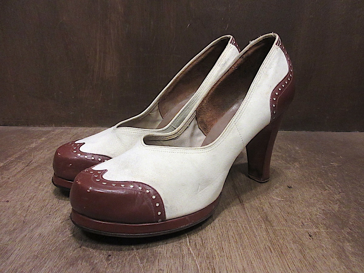 - ビンテージ30's40's●レディースレザー×スウェードパンプスsize 6 B●250805n8-w-pmp-24cmレトロヒールレディース靴