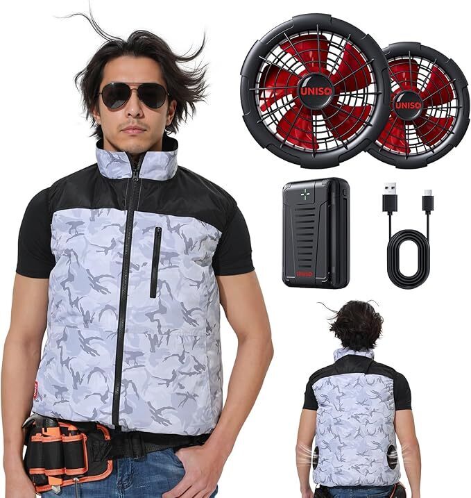 - 空調冷風服 最強ベスト冷風服 ファン付きベスト バッテリーセット 大風量 高出力 UVカット 体感-13°C L,迷彩ホワイト A651