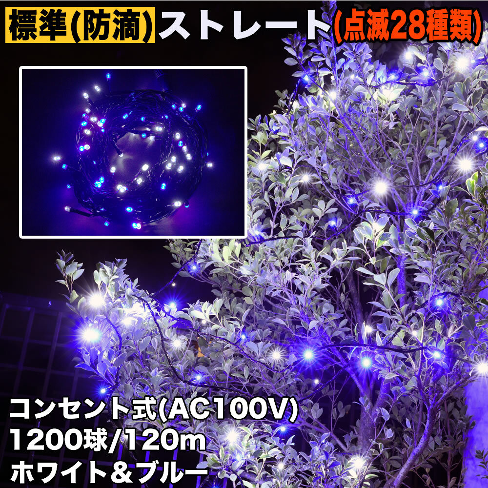 > クリスマス 防滴 イルミネーション ストレート ライト 電飾 LED 1200球 120m 2色 白 ・ ブルー 28種点滅 Bコントローラセット