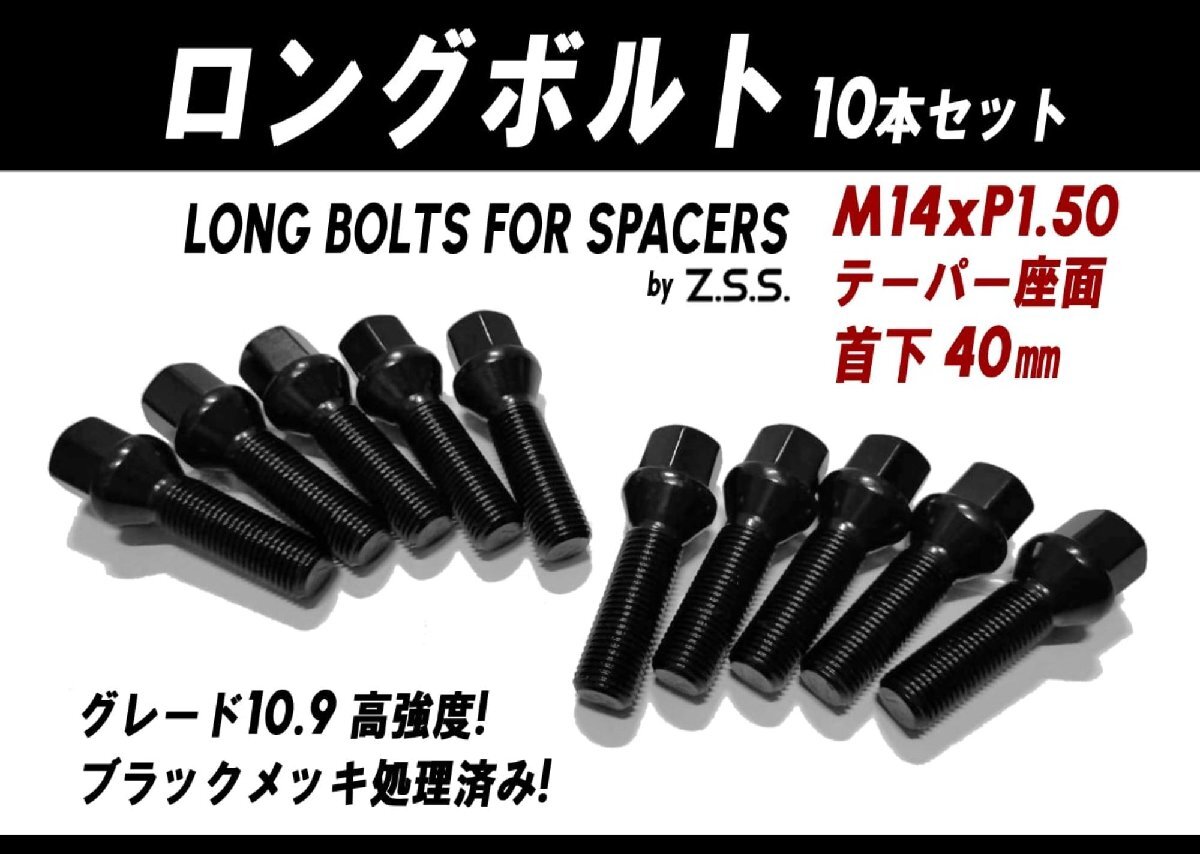 - Z.S.S. AP ロング ボルト テーパー座面 首下 40mm M14xP1.50 10本 スペーサー アウディ ベンツ VW 社外ホイール用 ハブボルト ブラック