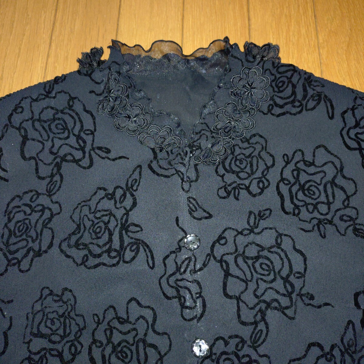 - 【同梱可】バラ柄 ブラウス 七分袖 黒 花レース襟