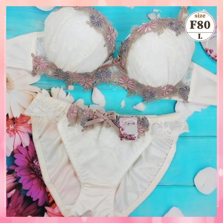 > Zf8035◎美胸ブラショーツセット【F80/L】下着 ランジェリー 丸胸 カラフルリトルフラワー アイボリー 新品未使用