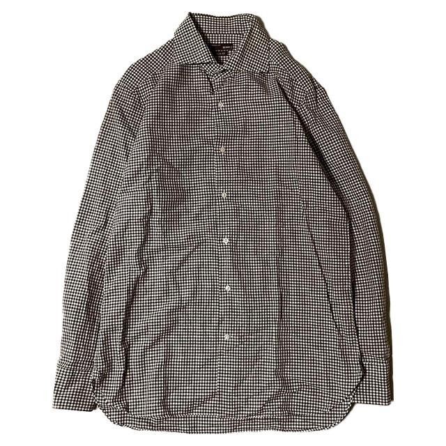 - ビームスF【BEAMS F】茶ギンガムチェック柄ドレスシャツ L 麻混 美品 E095