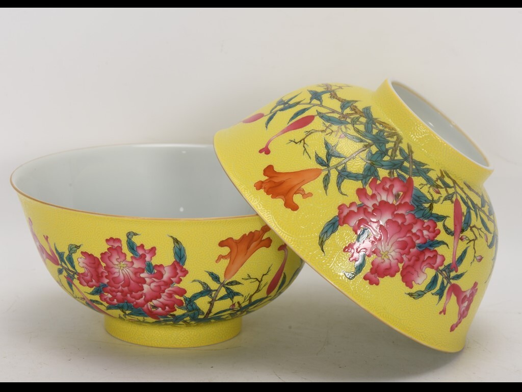 - YH106■大清雍正年製款 琺瑯彩 黄地爬花花卉紋碗2客【共箱】珍品 時代物 古玩 唐物 古陶磁器■