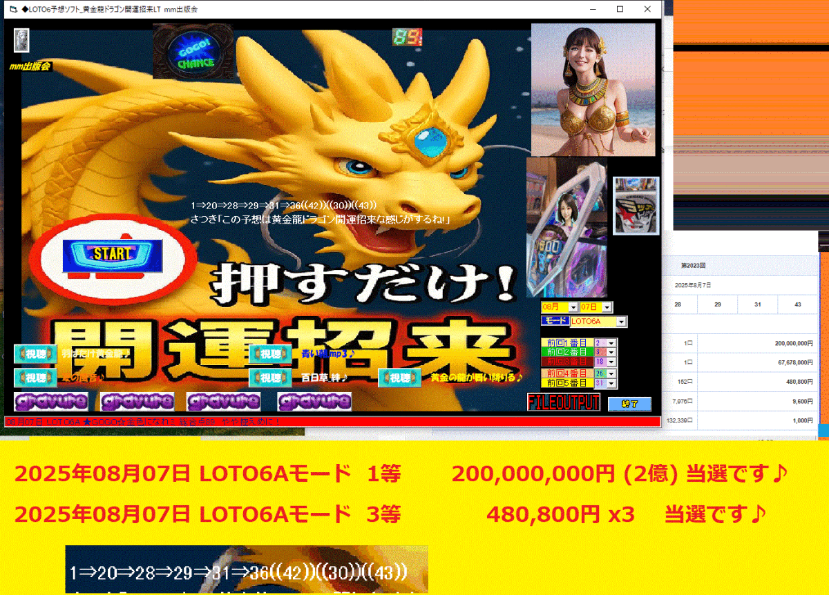 - 新作 [◆LOTO6予想ソフト_黄金龍ドラゴン開運招来LT] 2025年08月07日 LOTO6 1等 200,000,000円 (2億) 当選♪お盆祭