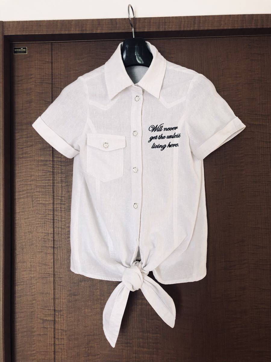 - Mサイズ相当 ホワイト 刺繍付き、裾タイ付き半袖シャツ、ブラウス