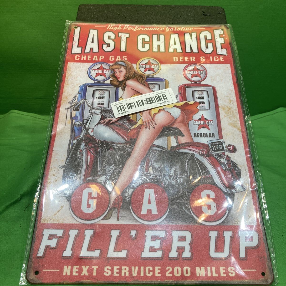 > ヴィンテージ風 ガスステーション看板 ブリキ看板 美女&ガソリンスタンド バイク アメリカンレトロ メタルサイン インテリア 未使用