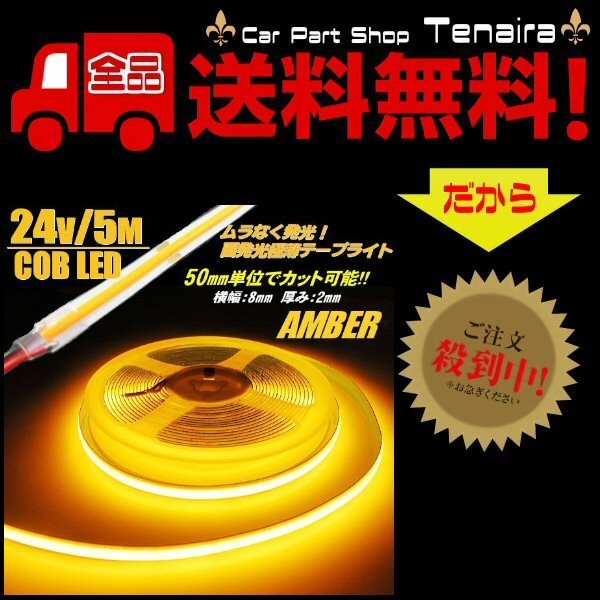 - 超光量! 24v COB 面発光 LED テープライト 5m巻き 極薄2mm オレンジ アンバー オレンジ 色ムラなし カット使用可能 メール便送料無料/3