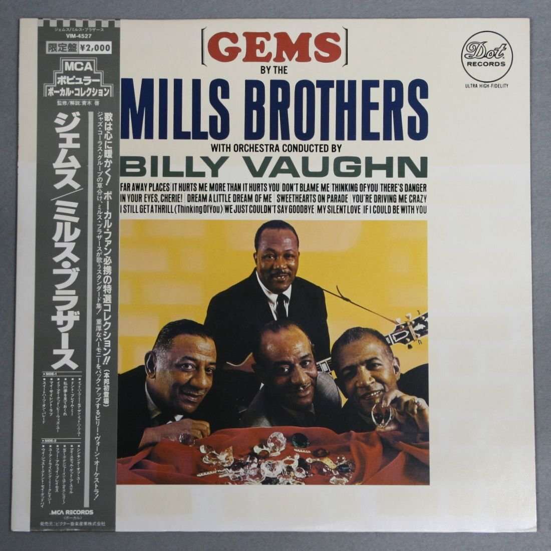 VIM-4527 .MCA 国内盤 中古LP「GEMS / ジェムス」ミルス・ブラザース MILLS BROTHERS SIDE A 1 It Hurts Me More Than It Hurts You2 Don't Blame Me3 Dream A Little Dream Of Me4 If I Could Be With You5 My Silent Love6 Sweethearts On Parade SIDE B 1 Thinking Of You2 I Still Get A Thrill (Thinking Of You)3 There's Danger In Your Eyes, Cherie!4 Far Away Places5 You're Driving Me Crazy6 We Just Couldn't Say Goodbye 盤 質:概ね良好(微スレ程度)ジャケット:薄日焼け、裏ジャケ右上にシワ、薄スレあり備 考:帯(薄シミあり)、ライナー 付き 送料は送料・配送についてをご覧ください。中古レコードに関してご理解のうえご入札ください。