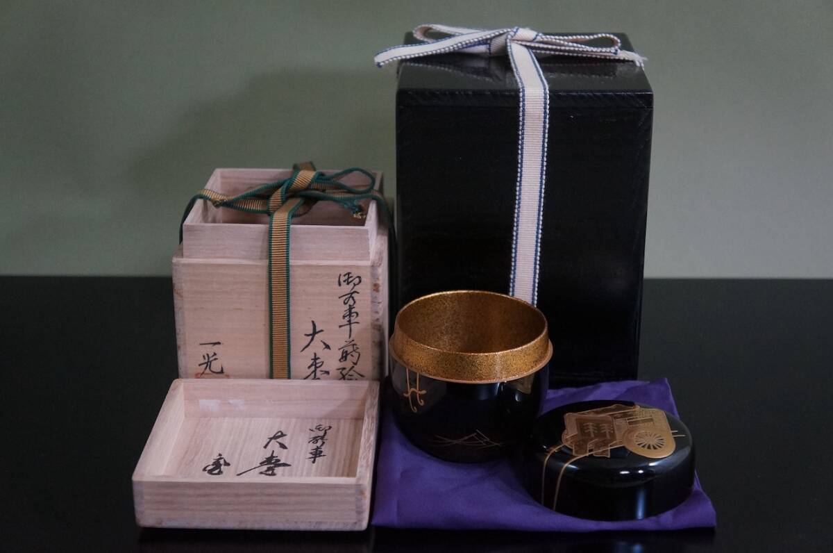 - ■ 大棗(御所車蒔絵・内梨子)「清瀬一光・鵬雲斎書付」(二重箱)★ 茶道具 保証品