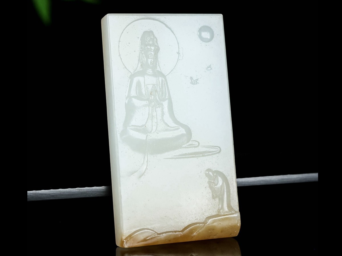 - 「清時代 和田玉 子料彫り 観音牌」極細工 裝身具 賞物 中国古美術 旧蔵出