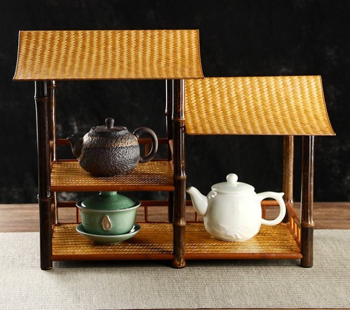 - 竹製品畳面茶棚中国式囲炉裏煮茶禅意梅鹿竹軒置物収納棚二重湯飲み棚