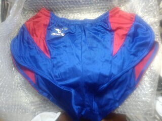 - MIZUNO製品、メンズ、ランパン、両サイドスリット全開、ブルー地赤切り返し入り、インナーパンツ無し、ポリエステル100%、Lサイズ、