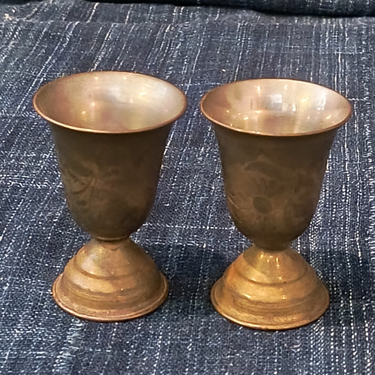 - インド ビンテージ 金属製 エッチング 脚付き カップ 2個組 検) ゴブレット シェリーカップ 古道具 民芸 骨董 古民芸 盃 真鍮 ブロカント