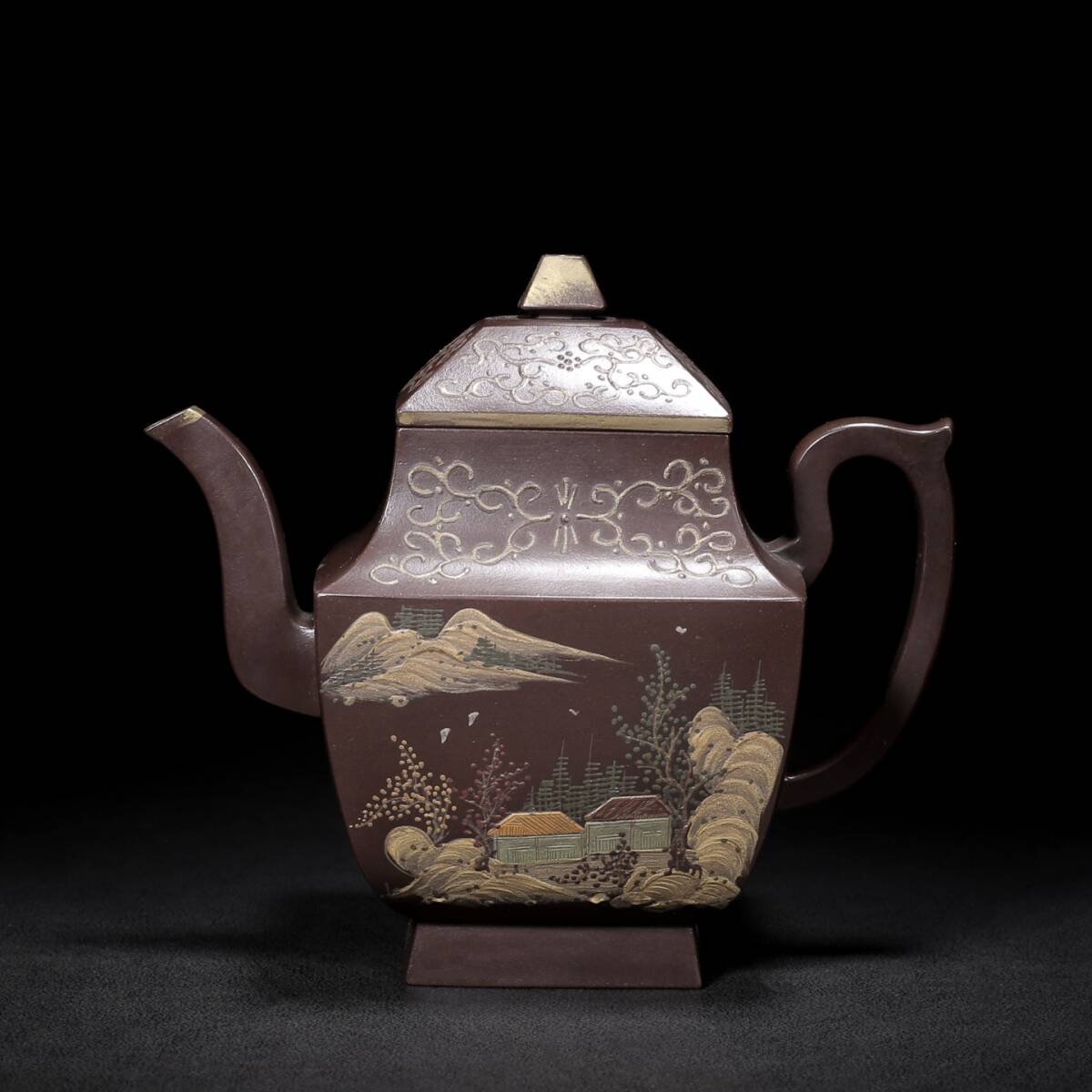 - 友人旧蔵 古原鉱紫泥製 四方壺 楊季初款 山水紋 紫砂壺 精品壺 急須 煎茶道具 茶道具 古賞物 古美味 東洋彫刻 時代物 骨董 中国古美術