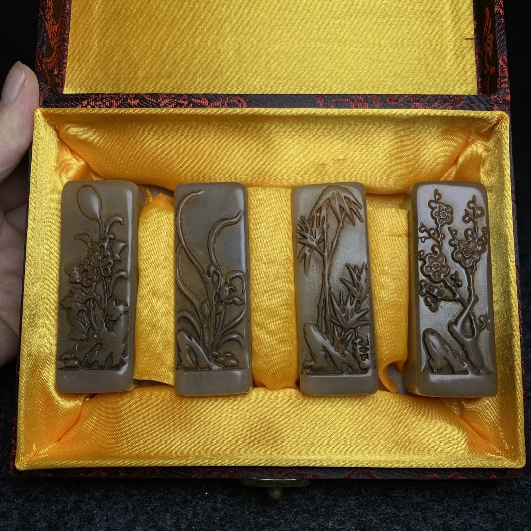 - 秘蔵 古木彫り 寿山石印鑑 梅蘭竹菊セット箱 清代 書道具 文房具 時代物 中国古美術 細密彫 置物 賞物 唐物 木彫り 文玩 8.16