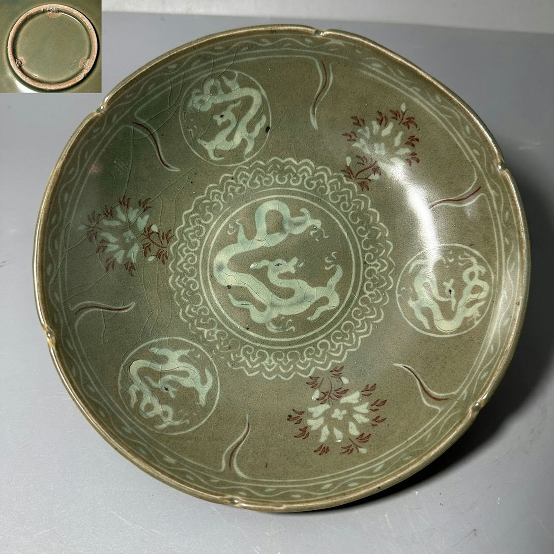 - ▼渡鶴羽▼R819コレクター放出 朝鮮古美術 高麗磁 李朝時代 古高麗 高麗青磁龍紋盤